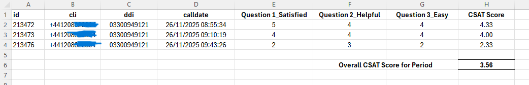 To calculate a Customer Satisfaction Score (CSAT) for a specific period, the exported file requires only minimal editing, typically totalling ratings and tidying the layout. An example completed file is provided to illustrate the process.